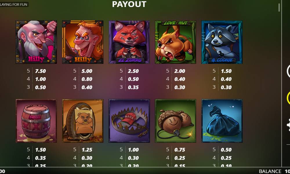 Papá Oso. El oso es un oso saltarín en los rodillos 2, 3 y 4. Por cada movimiento añade 1 valor al recolector y un multiplicador x1. Si el símbolo alcanza un valor máximo de 5, Papá Oso tendrá un multiplicador de x2 durante el resto de la ronda.
