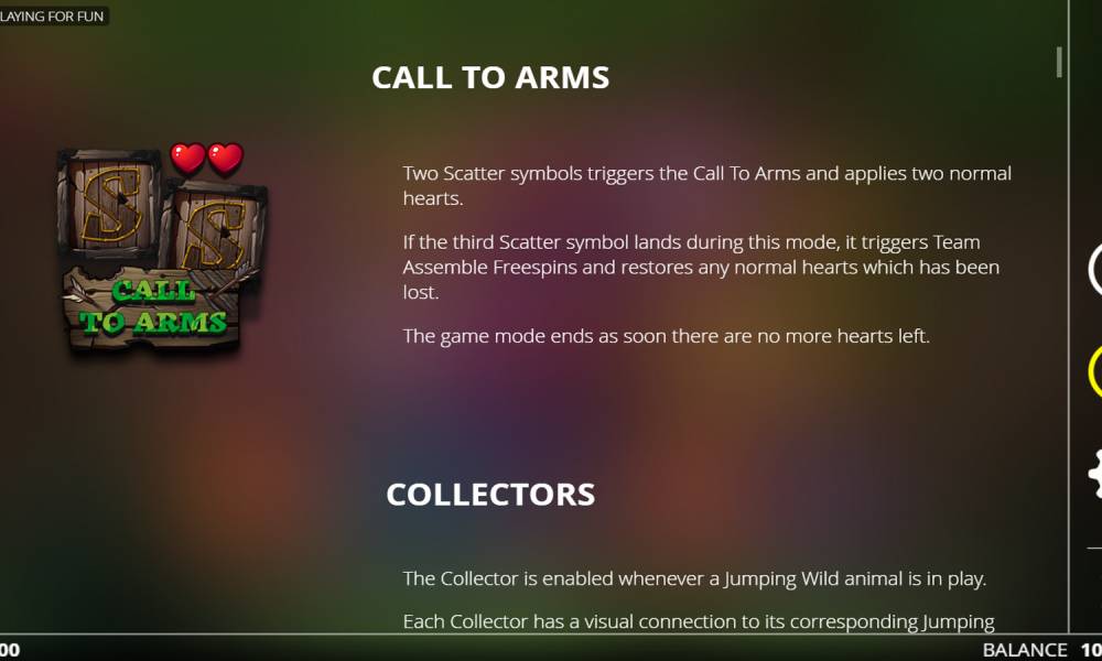 Coleccionistas. Cada bestia saltarina tiene su propio recolector que funciona durante las tiradas gratis. Por cada parada de la máquina de un conejo, oso o ciervo, se añade un valor al contador correspondiente. Si se recoge un máximo de 5, el símbolo mejorará y otorgará un corazón blindado que se colocará en un espacio vacío o sustituirá a uno existente.