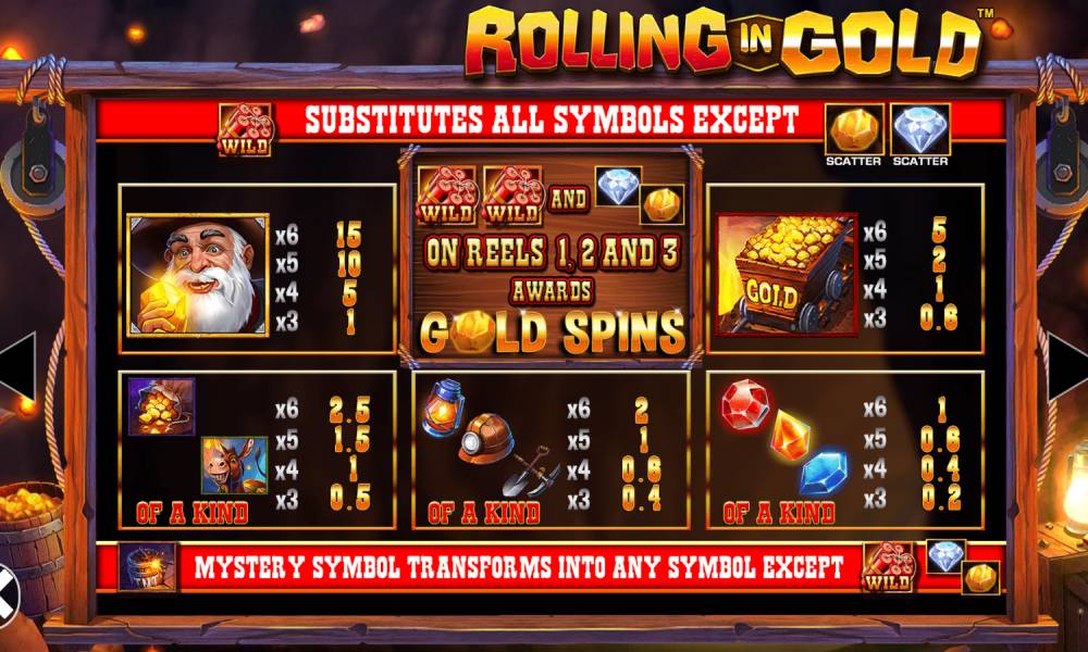 La tragaperras Rolling in Gold de Blueprint Gaming te permitirá sumergirte en el mundo de los buscadores de oro y sentirte como un auténtico minero sacando preciados lingotes. El juego tiene como telón de fondo la entrada de la mina, donde se pueden encontrar pepitas de oro. El inusual campo de juego en formato 3-3-4-4-4-4-4-4 ofrece a los usuarios miles de oportunidades de ganar. Una mecánica clara, emocionantes funciones de bonificación, grandes premios y un agradable acompañamiento musical hacen que esta tragaperras online sea emocionante y popular.