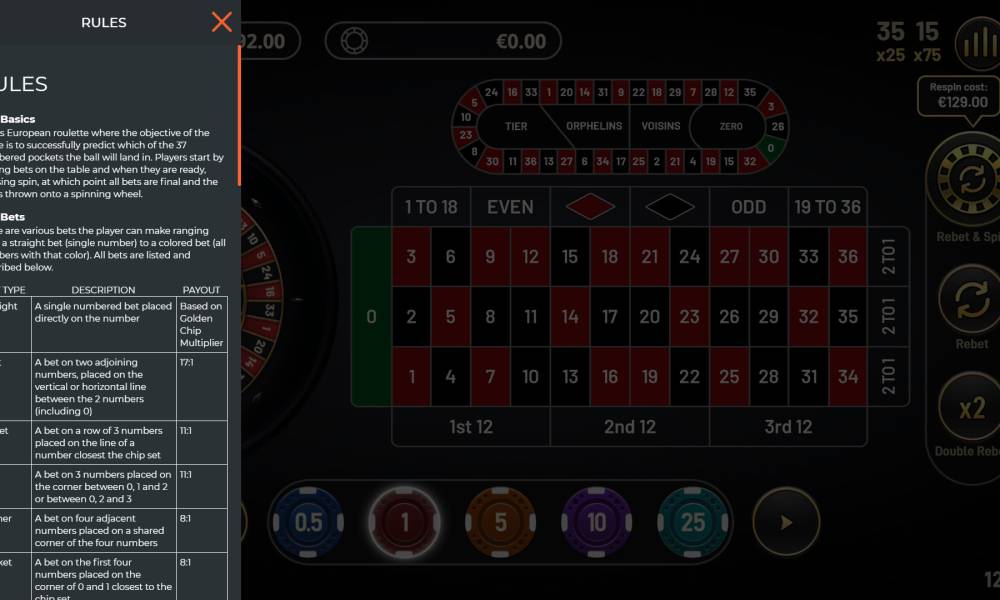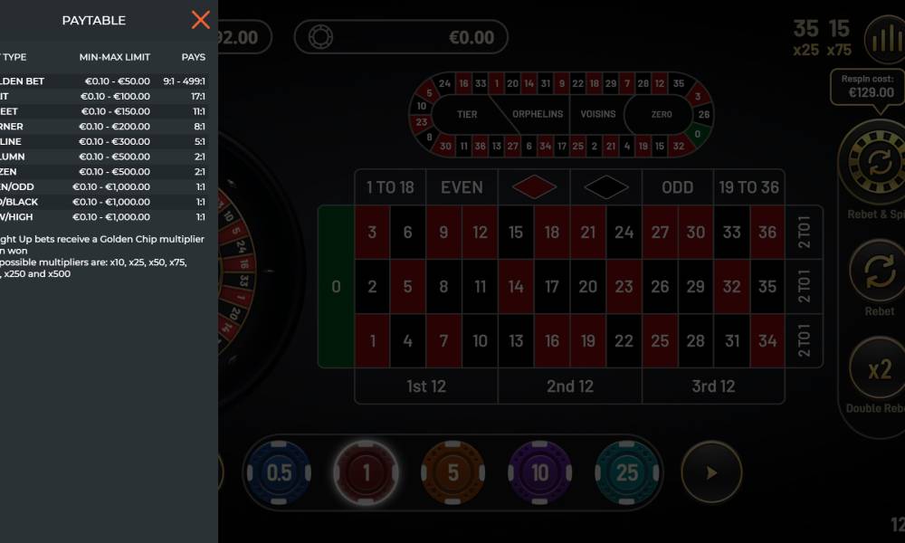 La Ruleta Golden Chip es una ruleta europea con números del 0 al 36 en la rueda, situados en el orden clásico.