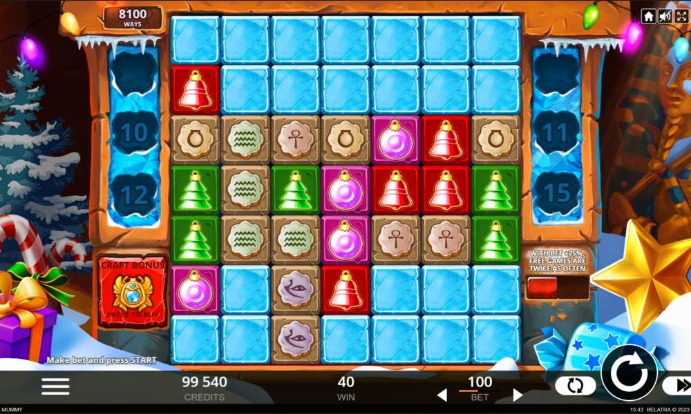 El conjunto básico de reglas de la tragaperras online Santa Mummy difiere poco de su popular predecesora. El campo de juego al comienzo de la ronda consta de 7 rodillos con una altura de 3 casillas. A medida que se eliminan las ganancias se congelan las casillas, abriendo nuevas líneas posibles y aumentando el tamaño del campo a 7x7. Cabe destacar el sistema de combinaciones contables, que requieren la ubicación de 3 o más símbolos en rodillos vecinos de izquierda a derecha. Las bonificaciones se realizan tanto al azar como activadas por el Scatter, que también desencadena tiradas gratis. En total, el juego involucra 8 símbolos regulares y 2 especiales en el proceso de girar los rodillos. El rango de apuestas es estándar, de 0,2 a 50 euros.