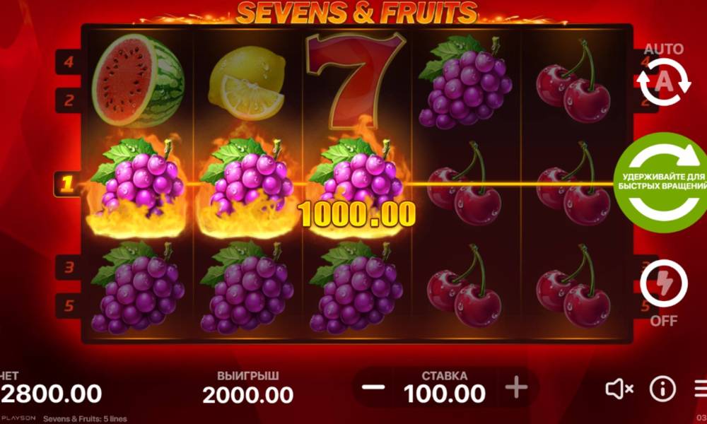 El dispositivo básico de Seven & Fruit tiene cinco rodillos y el mismo número de líneas activas fijas. Los símbolos se alinean en la pantalla en una cuadrícula de 5x3.