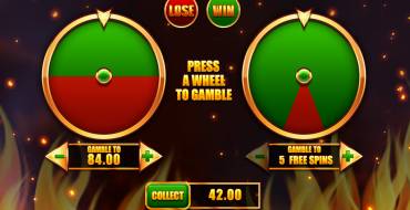 Apostar. Después de cualquier ganancia que exceda la apuesta, el jugador puede apostar. Hay dos opciones: ganar un premio en metálico (aumentar la recompensa disponible) o tiradas gratuitas. Este juego de azar tiene un aspecto inusual. El usuario tiene que hacer clic en una de las ruedas, que tienen sectores rojos y verdes. Pueden ser iguales o diferentes si el jugador aumenta la apuesta. Si la flecha apunta a la sección verde, el usuario ha ganado, a la sección roja - perdido. Puede girar las ruedas alternativamente o utilizar sólo una. La ganancia máxima en la suma es x5 del premio recibido por la tirada. Se pueden obtener hasta 24 tiradas gratuitas en el juego de riesgo.