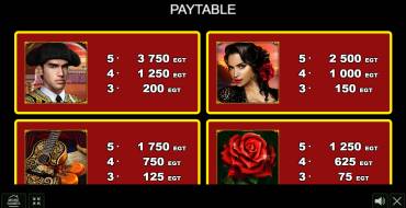 En cinco rodillos de 3 filas cada uno hay bellas imágenes de una mujer española y un español, una guitarra, una rosa, un candelabro (son símbolos caros) y las designaciones de las cartas más altas (4 símbolos baratos). Todos ellos forman combinaciones de tres piezas de izquierda a derecha. Líneas para pagos que el jugador puede elegir a su discreción - 1, 5, 10, 15, 20. En cada una puede apostar de 1 a 20 monedas. El rango total de apuestas en la ranura en línea - 0,01-1000 euros. Bonificaciones máquina tragaperras está representado por símbolos especiales, giros gratis, rondas Gamble y Jackpot Tarjetas.