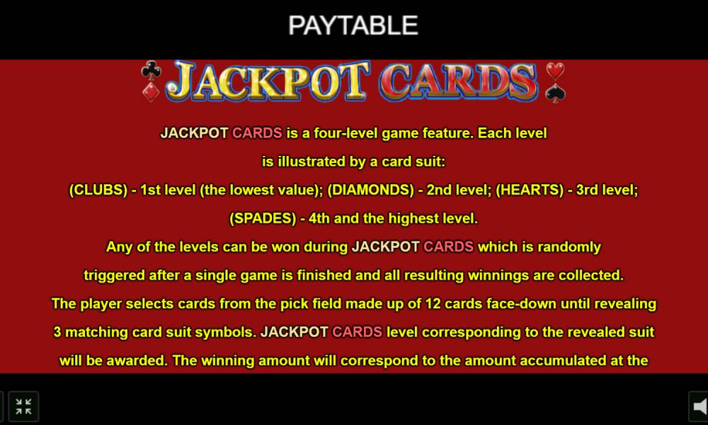 No es posible iniciar Jackpot Cards por sí solo. Esta ronda se activa en un momento aleatorio. Para ganar uno de los premios, el usuario necesita encontrar tres cartas idénticas. El palo denotará el premio gordo. Las picas son las más caras, los tréboles son baratos, los corazones y los diamantes están en el medio en cuanto a tamaño. Todos los botes no son fijos, sino progresivos.