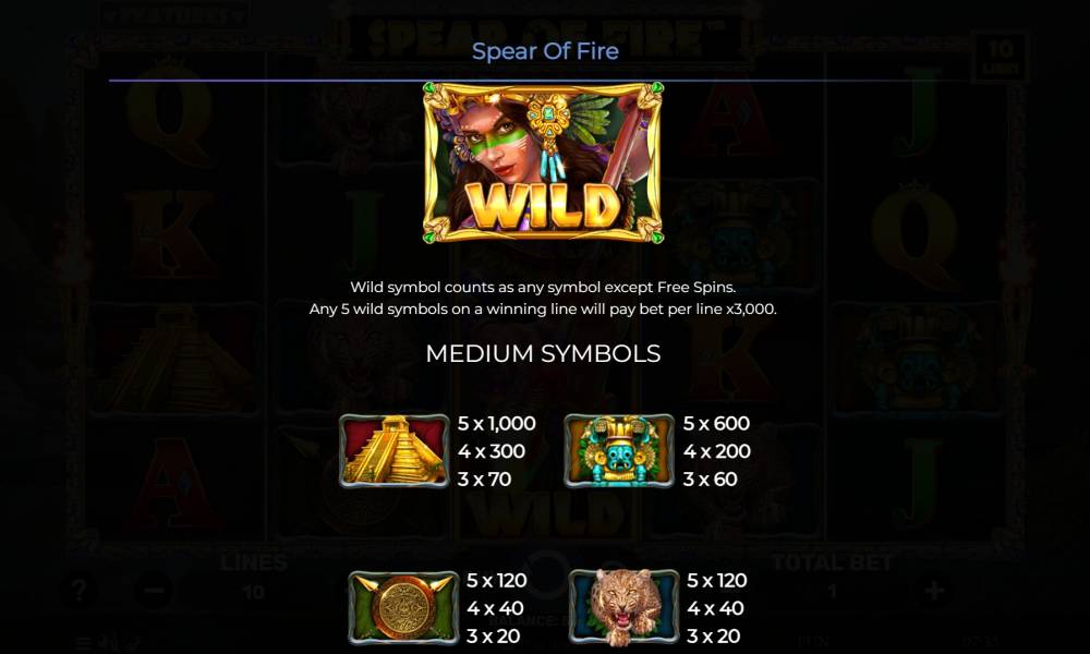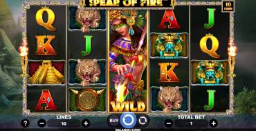 El campo de juego de Spear Of Fire tiene un tamaño de 5x4. La tragaperras ofrece la posibilidad de ajustar el número de líneas activas de 10 a 100, en múltiplos de 10. Es importante tener en cuenta que en el proceso de cambiar el valor puede aumentar el tamaño de la apuesta. Las combinaciones ganadoras se cuentan de la forma tradicional: del borde izquierdo al derecho. Las ganancias máximas posibles son x3000 de la apuesta por ronda.El rango de apuesta varía de 0,1 a 1000 y está ligado al número de líneas de pago seleccionadas. Hay un total de 8 símbolos estándar y 2 especiales en el juego. El modo de tiradas gratuitas activa la bonificación Walking Wild, que se mueve por los rodillos en cada tirada.