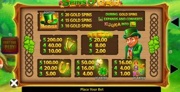 Spins O' Gold Fortune Play es una tragaperras online con 5 rodillos y 10 líneas de pago fijas. Los símbolos incluyen denominaciones de cartas tradicionales e imágenes temáticas como herraduras, arpas y ollas de oro. Se utilizan un total de 5 tipos de símbolos mayores y menores cada uno. Las combinaciones ganadoras se forman cuando coinciden símbolos idénticos en las líneas activas para obtener pagos de izquierda a derecha. La función de expansión de símbolos Wild, las tiradas gratis y el modo Fortune Play añaden variedad al juego proporcionando oportunidades de ganar adicionales. Los usuarios pueden apostar de 0,1 a 10 euros por tirada.