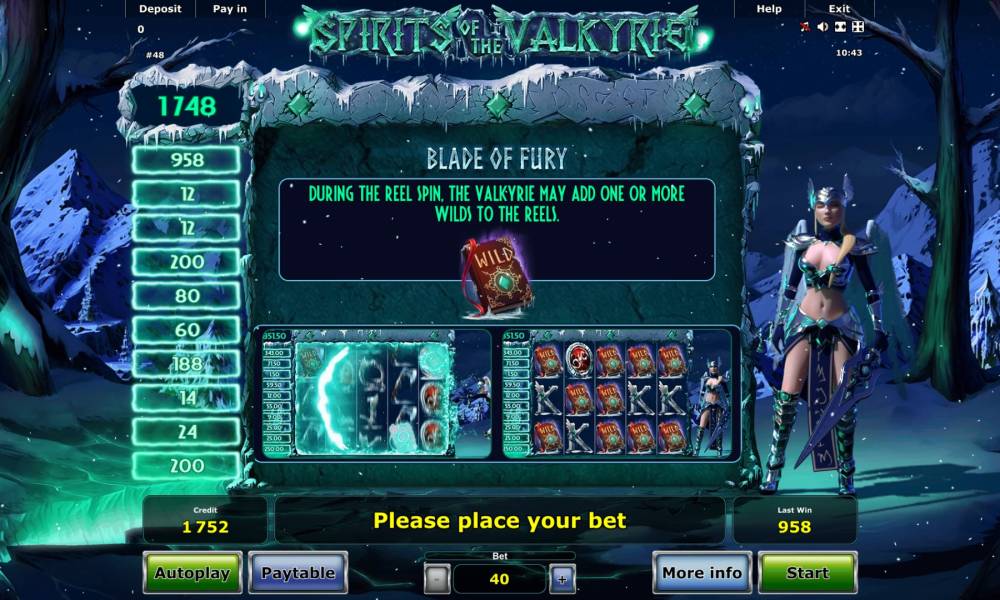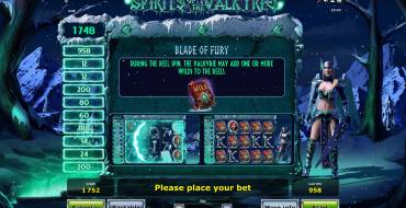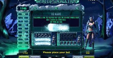La tragaperras Spirits of the Valkyrie tiene cinco rodillos giratorios y veinte carriles activos. En la línea se toman de doscientos a quinientos créditos (40 - 10000 monedas por tirada).