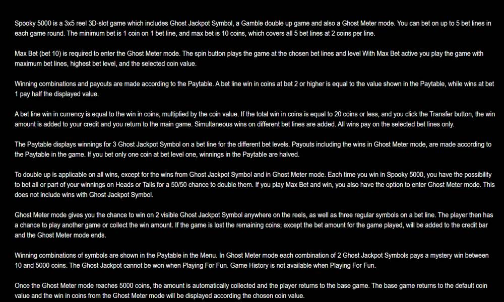 La tragamonedas de vídeo Spooky 5000 cuenta con 3 rodillos en 3 filas y 5 líneas de pago. Los jugadores pueden elegir el número de niveles, que son 10 en total, y apostar de 0,01 a 20 monedas. Todas las líneas ganadoras están marcadas con números. El mínimo es jugar en 1 nivel en 1 línea con una apuesta de 1 moneda del valor más bajo del rango establecido por las reglas. El máximo puede incluir 10 niveles (5 líneas ganadoras de 2 monedas cada una) con la apuesta más alta de 200 euros. Combinaciones ganadoras de 3 símbolos idénticos situados en líneas activas. Cada tipo de símbolos da un cierto multiplicador a la apuesta, su valor para ganancias por 2 o más apuestas se puede encontrar en la tabla de pagos. Las ganancias en la apuesta 1 equivalen a la mitad del valor especificado. La cantidad ganada se calcula multiplicando el número de monedas por su valor nominal.