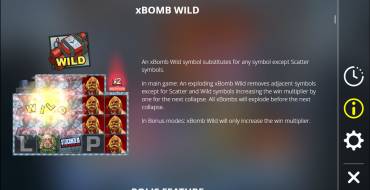 Función SOS. El principio es el mismo. Tres símbolos SOS deben detenerse en los rodillos sucesivamente. El símbolo central se convertirá en una bomba y explotará, eliminando las casillas vecinas y activando la avalancha. Esto sólo es posible si la ronda no ha dado combinaciones premiadas. En el modo de bonificación, la función siempre funciona.