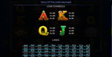 The Story Of The Little Mermaid es una tragaperras online con un campo de 5 rodillos y una altura de 4 casillas. El número de líneas para hacer combinaciones oscila entre 10 y 100. La peculiaridad del juego es que el propio jugador determina cuántas direcciones utilizar en la siguiente ronda. En el juego intervienen 8 símbolos estándar y 2 especiales. Las combinaciones ganadoras se forman de izquierda a derecha con más de 3 símbolos idénticos seguidos.