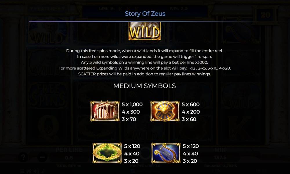 El número de tiradas gratuitas en Story Of Zeus depende del número de símbolos Scatter que caigan. 3 símbolos te dan 10 intentos, 4 - 25, y 5 símbolos - ¡50 tiradas gratuitas! Durante la bonificación, se activa la función Respin Expanding Wilds. Todas las ganancias tienen en cuenta el tamaño de la apuesta que había en el momento de activarse. Si además tienes en cuenta el número de respins, la bonificación es extremadamente atractiva.