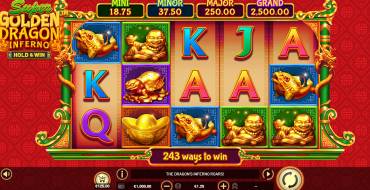 Super Golden Dragon Inferno - Hold&Win es una brillante tragaperras de cinco tambores con mecánica de pago por línea fija (243 fichas). El campo de juego tiene un formato de 5x3. El pago se realiza por 2 o más símbolos idénticos, empezando por el primer rodillo. El juego utiliza 4 tipos de símbolos junior y senior cada uno. Hay símbolos especiales que activan las funciones de bonificación, la ronda de bonificación Hold&Win y la compra de respins. Los jugadores pueden apostar en una tirada desde 0,25 € hasta 125 €. La ganancia máxima es x2916 del importe apostado.