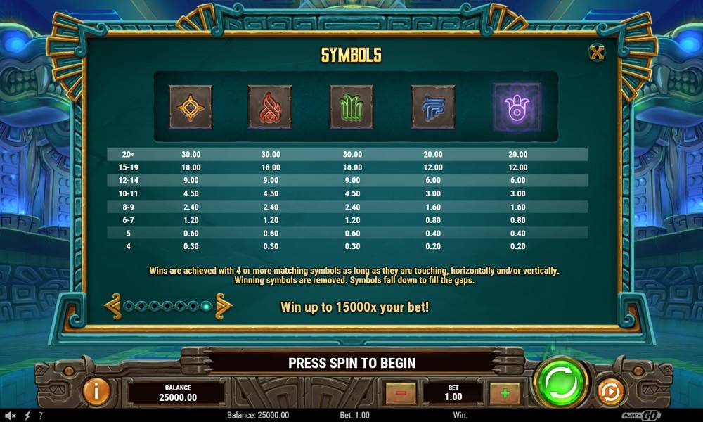 El campo de juego en el Templo de Tollan no es estándar, hay 7 carretes de 7 celdas de altura cada uno. Para tener en cuenta las combinaciones involucradas sistema de cascada de racimo, cuando los símbolos ganan cuando la ubicación de 4 piezas vertical u horizontalmente en una fila. En las celdas vacías en lugar de símbolos jugados desde arriba caen otros nuevos, por lo que una ronda puede durar bastante tiempo y traer una buena ganancia. En el modo normal del juego es posible activar el multiplicador en la rotación actual, hasta x4.