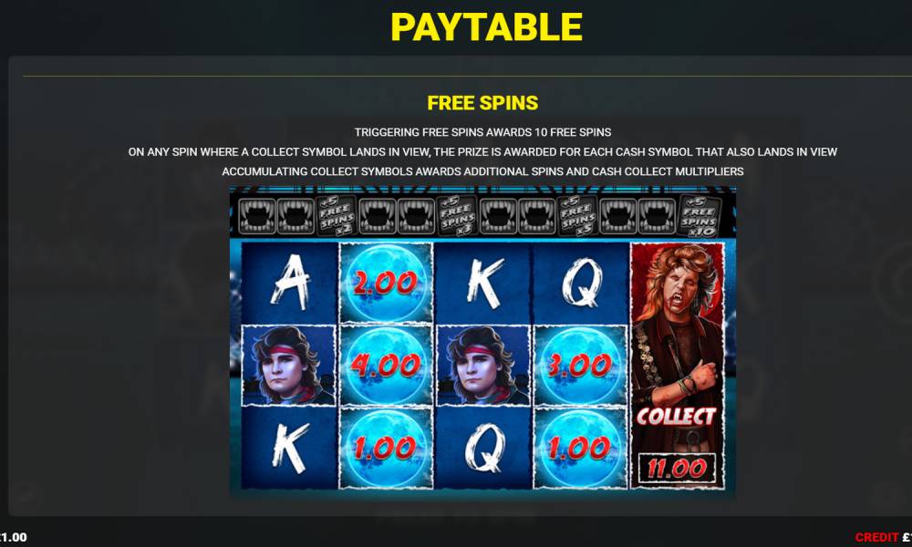 En la tragaperras online The Lost Boys se pueden ganar cuatro botes fijos. Aparecen en forma de símbolos de Cobrar. Si hay un símbolo de cobro, el jugador obtiene un premio. Su tamaño depende de la apuesta actual en la ronda: