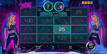 Night Racing utiliza un campo de juego clásico de 5x3 en el modo de tiradas normales. 25 líneas fijas se encargan de formar combinaciones. En los rodillos se juegan 9 símbolos normales y 2 especiales que proporcionan bonificaciones y tiradas gratis. Las ganancias máximas llegan hasta x20000 de la apuesta, lo que está bastante bien, porque se elige entre un rango de 0,25 a 100 euros. Las combinaciones se cuentan de izquierda a derecha, a partir de tres caracteres idénticos seguidos. El símbolo WIld activa las tiradas gratis, por lo que en el modo normal él y no participa.