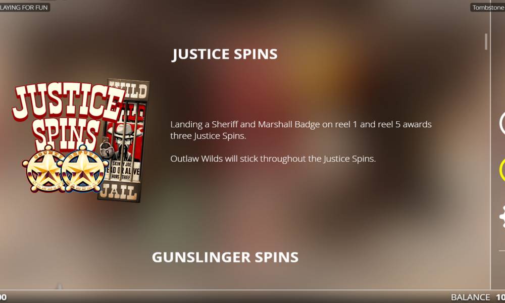 Tiradas de Justicia. Cuando un icono de sheriff aparece en el rodillo 1 y un icono de marshal aparece en el último rodillo, el jugador obtiene tres respins. Durante estos, todos los comodines serán fijos, permaneciendo en los rodillos hasta el final de la ronda.