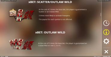 xApuesta: Outlaw Wild. Aumentando la apuesta 5 veces, el usuario obtendrá el símbolo Outlaw Wild en los rodillos 2, 3 ó 4.