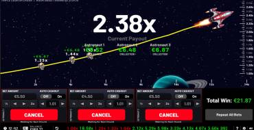 Auto Cashout - diseñado para permitir la expulsión automática del astronauta. El usuario debe seleccionar junto al multiplicador de la apuesta, cuando se alcance, el astronauta saldrá del cohete. Se pueden establecer parámetros diferentes o iguales para tres astronautas.