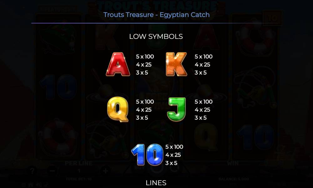 En modo normal, la tragaperras Trout's Treasure - Egyptian Catch es bastante estándar, pero todo se transforma durante las bonificaciones. El jugador se enfrenta a un campo de 5x3 con 10 líneas de pago fijas. Para conseguir una combinación ganadora, se necesitan tres o más símbolos idénticos seguidos desde el rodillo izquierdo al derecho. En total, el juego utiliza 3 símbolos especiales y 9 de fila. La apuesta que el jugador puede elegir oscila entre 0,1 y 100 euros, y las ganancias máximas están limitadas a x2000. Las tiradas gratuitas se activan de la forma habitual, con la ayuda de símbolos Scatter. Debido a la alta volatilidad de las ganancias de los bonos son muy tangibles.