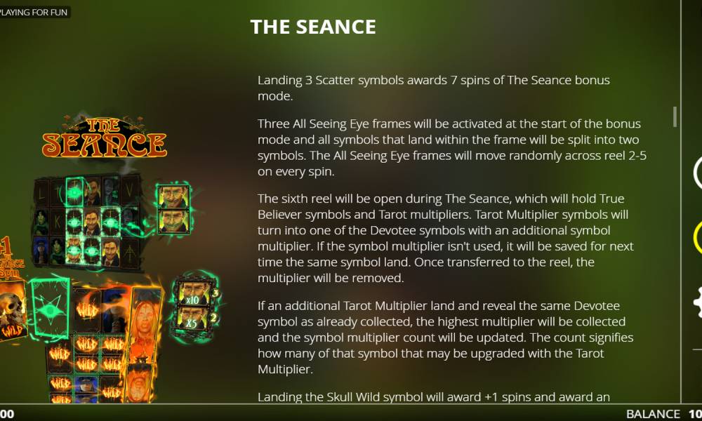 xApuesta. Cuando un jugador aumenta su apuesta tres veces, tiene 4 veces más probabilidades de activar The Seance y 6 veces más probabilidades de activar Sacrifice Spins.