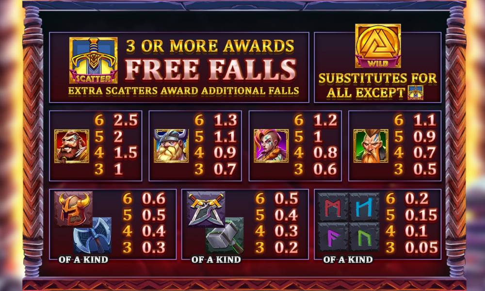 Viking Fall lleva a los jugadores al mundo de los duros guerreros escandinavos, donde los fríos fiordos, las antiguas runas y los poderosos dioses determinan el destino de cada luchador. Los gráficos de la tragaperras son de gran calidad, con símbolos detallados y animaciones que crean la sensación de una batalla épica. El acompañamiento musical complementa a la perfección la atmósfera de Viking Fall. Fuertes golpes de tambor, inquietantes sonidos de cuerno y música orquestal hacen que el jugador se sienta como si estuviera participando en una gran campaña vikinga.