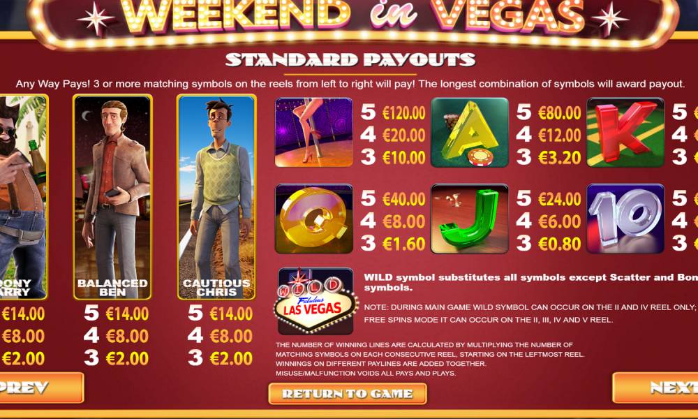 Weekend in Vegas es una tragaperras online lanzada por el proveedor Betsoft en febrero de 2016. Trata de tres chicos (Larry, Chris y Ben) que deciden divertirse y probar suerte. Quieren visitar todos los casinos de Las Vegas y conseguir un buen botín. Si tendrán éxito o no es una incógnita, pero los chicos se divertirán seguro. El juego va acompañado de música temática divertida y sonidos de ganancia. La tragaperras tiene un montón de funciones de bonificación y rondas extra que te pondrán nervioso y feliz. La tragaperras te mantiene en suspense y al mismo tiempo sacia la excitación de la gente.