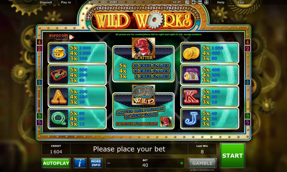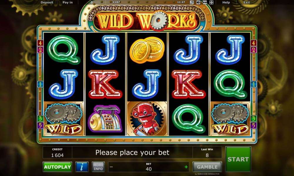 La tragamonedas de vídeo Wild Works de Eurocoin (Novomatic) atraerá a los aficionados a la maquinaria. Presenta a los jugadores un alegre robot que estampa monedas de oro. El modelo es interesante por sus reglas favorables para formar combinaciones y características de juego adicionales, que se describen en la reseña de Casinoz Gambling Encyclopedia.