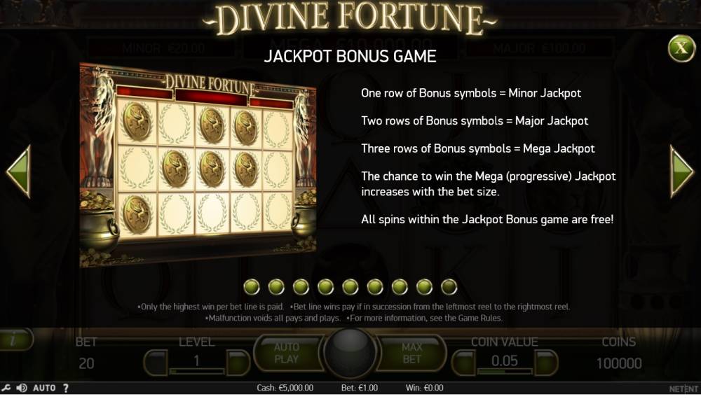 Al igual que el resto de progresivos de Netent, Divine Fortune cuenta formalmente con tres jackpots. Los botes Menor y Mayor están fijados en 20x y 100x.